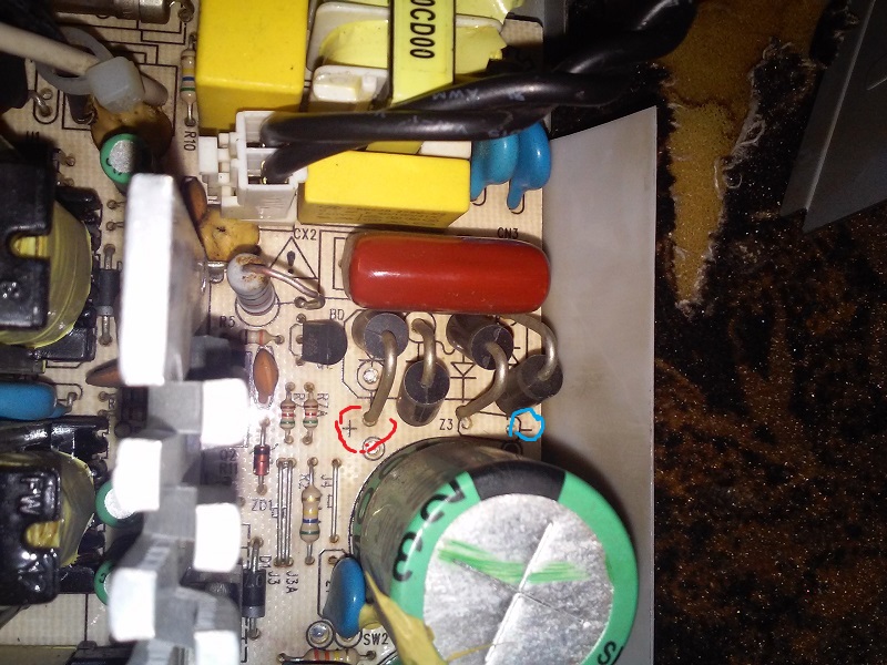 Witam mam problem. Posiadam zasilacz komputerowy jednak nie chce się uruchomić. Zasilanie dochodzi do płytki, gdy zwieram zielony i czarny w celu uruchomienia czyli PS-ON słychać ''psyknięcie'' i tyle. Jeden z rezystorów mocy miał zimny lut ale poprawiłem. Nie pokoi mnie napięcie na mostku prostowniczym. W zaznaczonych kolorami punktach wynosi ono 700V AC!!!! pomimo, że powinno panować napięcie stałe.. Diody prostownicze jednak nie mają przejścia w obie strony czyli są ok. Gdzie może leżeć problem? Pozdrawiam i dzięki.