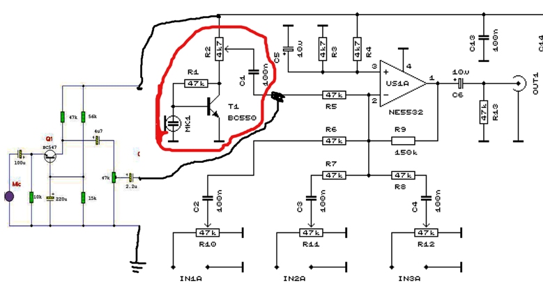 Witam; na tle innych, nawet niezbyt profesjonalnych konstrukcji, ten układ jest po prostu "cieniutki", zaprojektowany w sposób przesadnie oszczędny. Stopień wejściowy - prawdopodobnie zaprojektowany z zamiarem współpracy z mikrofonem elektretowym - raczej z takim, ani żadnym innym współpracowac nie bedzie (napewno nie z prawdziwym mikrofonem pojemnościowym!!!). Dziwny jest też sposób podłączenia dodatkowych wejść. Dorysowany układ wejściowy jest kolejnym dziwolągiem - widziałem wiele wzmacniaczy wejściowych dla mikrofonów, ale nigdy w układzie ze wspólną bazą. Taki wzmacniacz ma bardzo mała oporność wejściową i niepotrzebnie obciąża mikrofon. Taka konfiguracja stosowana była we wstępnych wzmacniaczach w.cz. (głowice UKF/VHF) - z kilku róznych powodów. Myślę, że w necie można znaleźć bez problemu ciekawsze i proste rozwiązania mikserów audio.