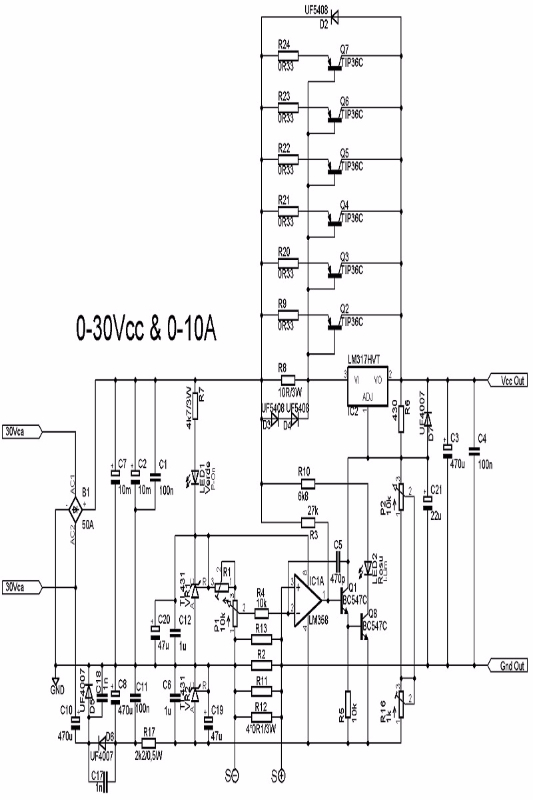 znalazlem jeszcze inny schemat i ten jest duzo prostszy do budowy i mniej czesci, tylko nie wiem czy da sie z niego wydusic 10A i czy wogole to zadziala ? a ten rezystor 0.15R to jest rezystor mocy ,czy wystarczy zwykly? chcialbym sobie zrobic zasilacz regulowany ale cizeko znalesc jakis sensowny schemat bo wiekszosc jest zbyt skomplikowana albo brakuje opisu wartosci elementow .wgl dzieki za pomoc bo ja z elektroniki to tylko lutowac potrafie :D